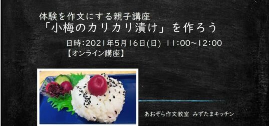 体験を作文にする親子講座 「小梅のカリカリ漬け」を作ろう 【オンライン講座】 日時:2021年5月16日(日) 11:00~12:00 オンライン(zoom) ・参加費:塾生親子1000円 外... 続きを読む