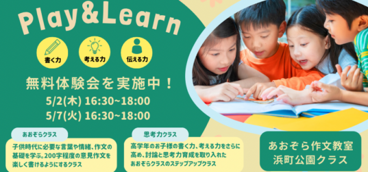 🍀無料体験会を開催します🍀 人気の浜町公園クラス! まずは一度、あおぞら作文教室の楽しい授業に参加してみてください🎵 ◆あおぞらクラス◆お子様の個性に合わせた指導で、子ども... 続きを読む