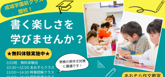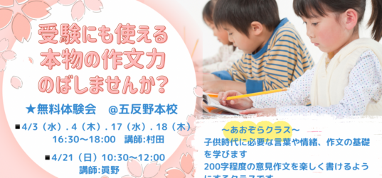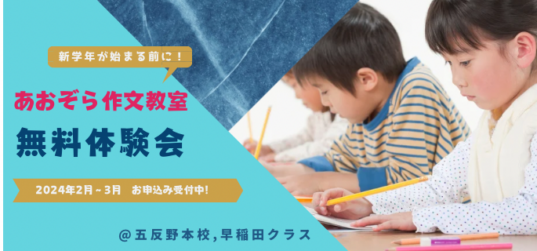 🌸あおぞら作文教室 五反野本校にて無料体験会を開催🌸 新学年になる前に、あおぞら作文教室の授業を体験してみませんか? まずは一度、あおぞら作文教室の楽しい授業に参加してみてください🎵 &... 続きを読む