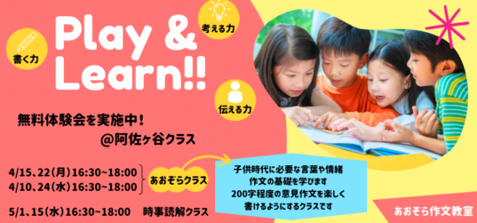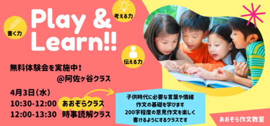 🌸あおぞら作文教室の各クラスの無料体験を受け付けています🌸 新学年になる前に、あおぞら作文教室の授業を体験してみませんか? まずは一度、あおぞら作文教室の楽しい授業に参加してみてください... 続きを読む
