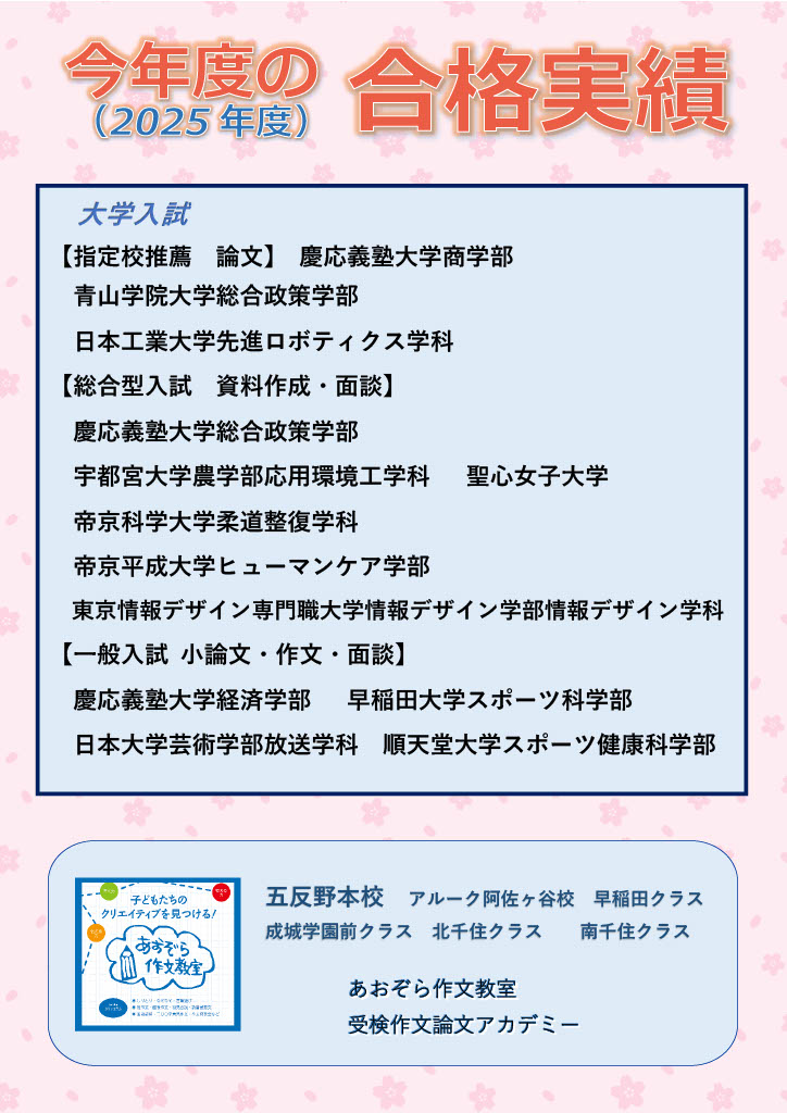 プロが教える!受験作文 個別指導の「あおぞら作文教室」| 五反野・阿佐ヶ谷・早稲田・北千住・成城学園前
